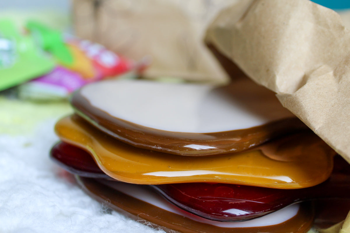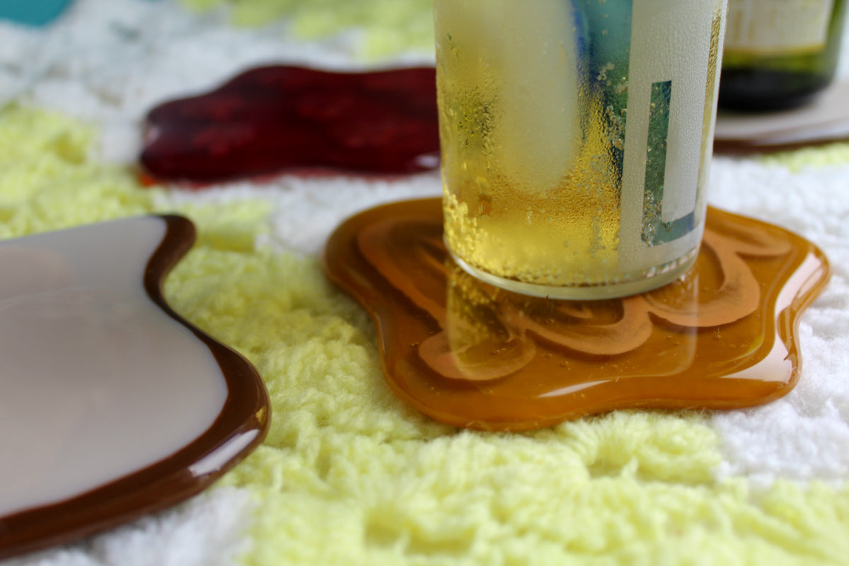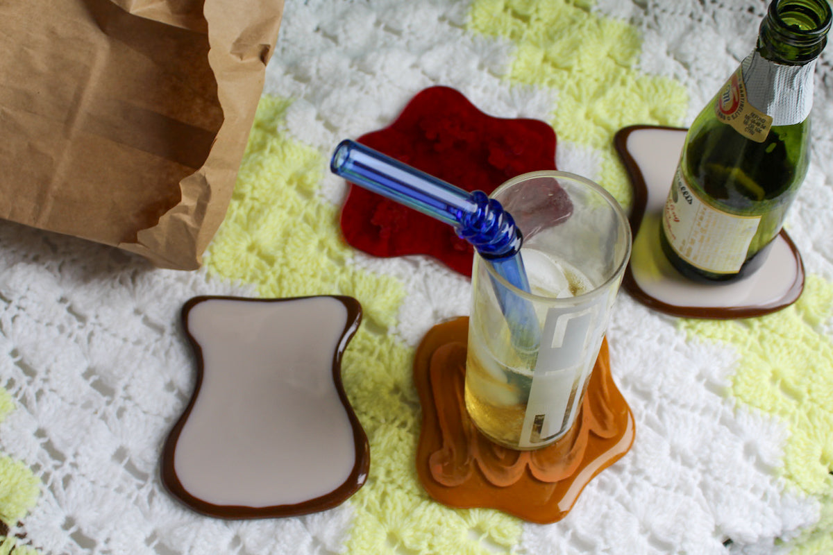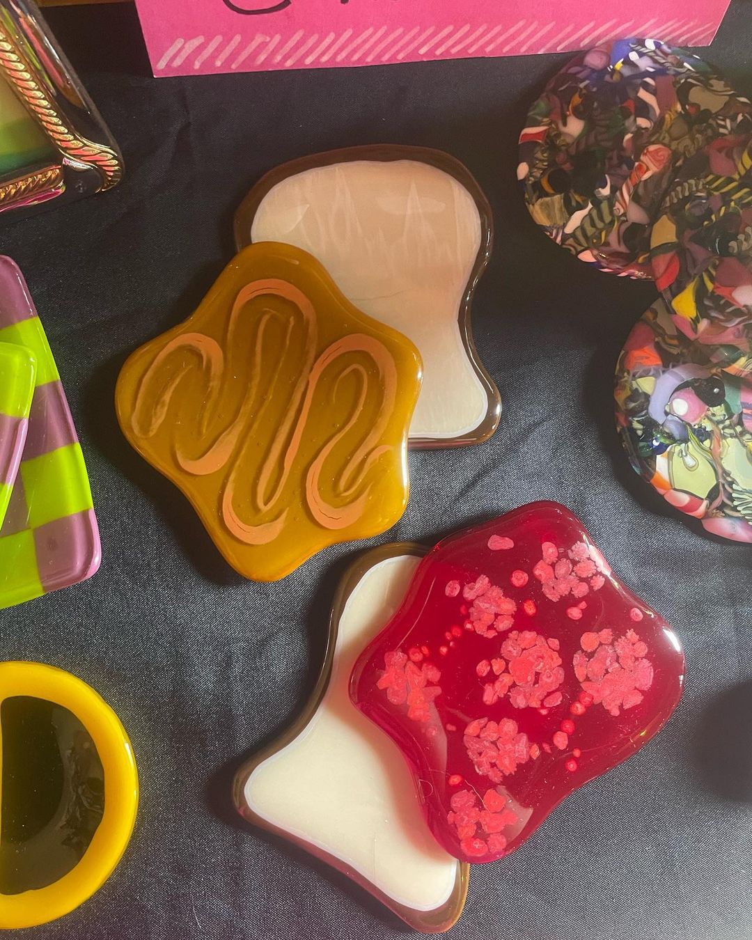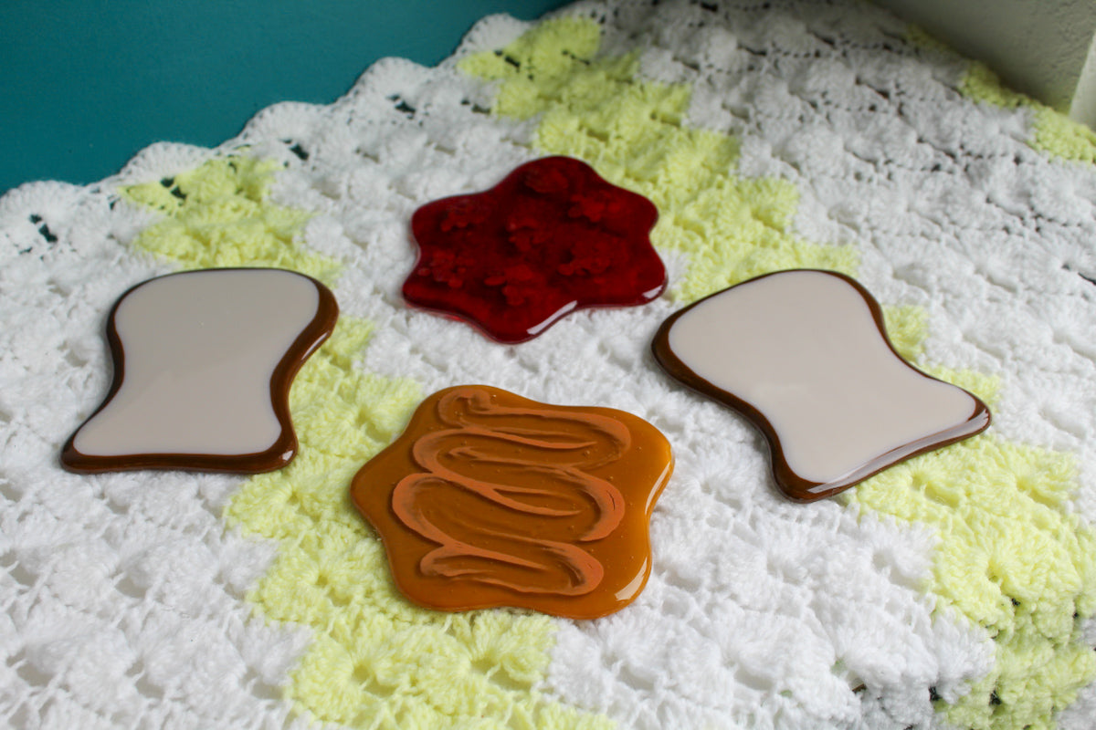 Handmade fused glass peanut butter and jelly coasters! Featuring hand-painted swirls of golden peanut butter and delightful dollops of berry bits throughout the jam, these coasters are a one-of-a-kind statement piece for any food lover or maximalist home designer. Comes complete with two slices of bread!